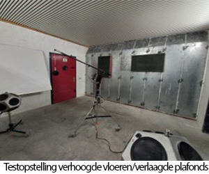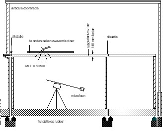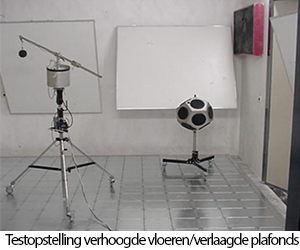 Wanneer het te onderzoeken bouwelement een vloerafwerking of een zwevende dekvloer is, dan maken we gebruik van onze standaard betonnen laboratoriumvloer en bepalen we de contactgeluidisolatie-verbetering, ∆L [dB]. Voor lichte vloeren, daken e.d. maken we gebruik van een meetopening van 4,0 m x 4,0 m tussen 2 boven elkaar gelegen meetruimten. De vloer of het dak wordt in de meetopening ingebouwd en dan wordt de absolute waarde van de contactgeluidisolatie Ln [dB] gemeten.