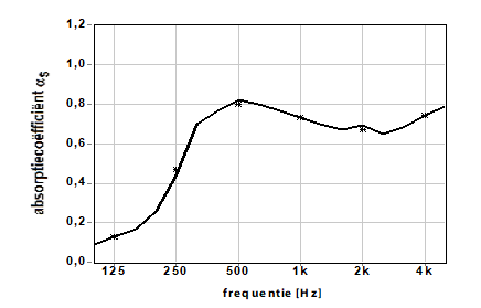 Deze kwaliteit wordt uitgedrukt in de absorptiecoëfficiënt, deze varieert van 0 voor niet absorberend tot 1,0 voor geheel absorberend. Productinformatie over de geluidabsorberende kwaliteit van een materiaal is gebaseerd op een meting in de nagalmkamer.