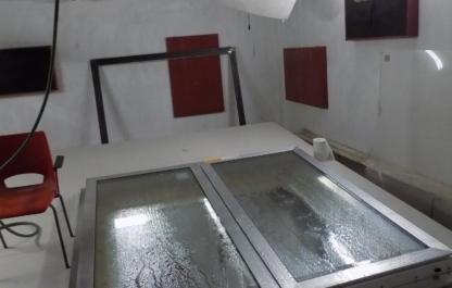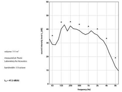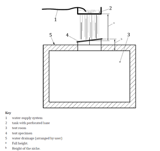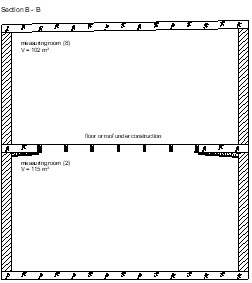 Om de geluidafstraling ten gevolge van regengeluid te bepalen wordt het testobject ingebouwd in meetopening E van ons Laboratorium voor Akoestiek. In de bovengelegen meetruimte (8) wordt een installatie opgebouwd bestaande uit een gestandaardiseerde tank met een geperforeerde bodemplaat. Deze tank wordt gevuld met water. Door deze tank wordt een continue stroom van kunstmatige regendruppels gegenereerd. De afmetingen van de tank en de hierin aangebrachte perforaties zijn overeenkomstig tank type voor “heavy rain”, conform de meetnorm ISO 10140-5. Het water wordt geruisarm afgevoerd.