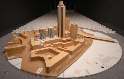 Vanaf het begin van het ontwerpproces tot aan de oplevering is Peutz als integraal adviseur bouwfysica, akoestiek en brandveiligheid bij het project betrokken. Zo is ten behoeve van het nieuw op te stellen bestemmingsplan een akoestisch onderzoek inzake geluidbelasting ten gevolge van het wegverkeer bepaald. Hierbij zijn eveneens de randvoorwaarden opgesteld waaraan het ontwerp dient te voldoen opdat voldaan wordt aan het geluidbeleid van de gemeente Rotterdam. Daarnaast is ten behoeve van het nieuwe bestemmingsplan een bezonnings- en beschaduwingsonderzoek uitgevoerd alsmede een onderzoek naar het windklimaat. Bij dit onderzoek is gebruik gemaakt van onze atmosferische grenslaag windtunnel; specifiek aandacht is gegeven aan het windklimaat rondom het het complex (Gedempte Zalmhaven en Houtlaan) alsmede ter hoogte van de daktuin (op de parkeergarage) en de entrees (zie onderstaande afbeelding). Tevens is een windtunnelonderzoek uitgevoerd voor de bepaling van de te verwachten extreme fluctuerende winddrukken op de Zalmhaven I alsmede de krachten en momenten op de hoofddraagconstructie. Aanvullend op voornoemde windtunnelonderzoeken is tevens een windtunnelonderzoek uitgevoerd (met behulp van tracergas) naar de gevolgen voor de luchtkwaliteit van de mechanische uitblaasvoorziening van de parkeergarage.